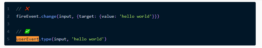 The fireEvent.change will simply trigger a change event on the input, whereas the userEvent.type call will trigger keyDown, keyPress and keyUp events for each character. As a result, this implementation is much more like actual user behaviour.